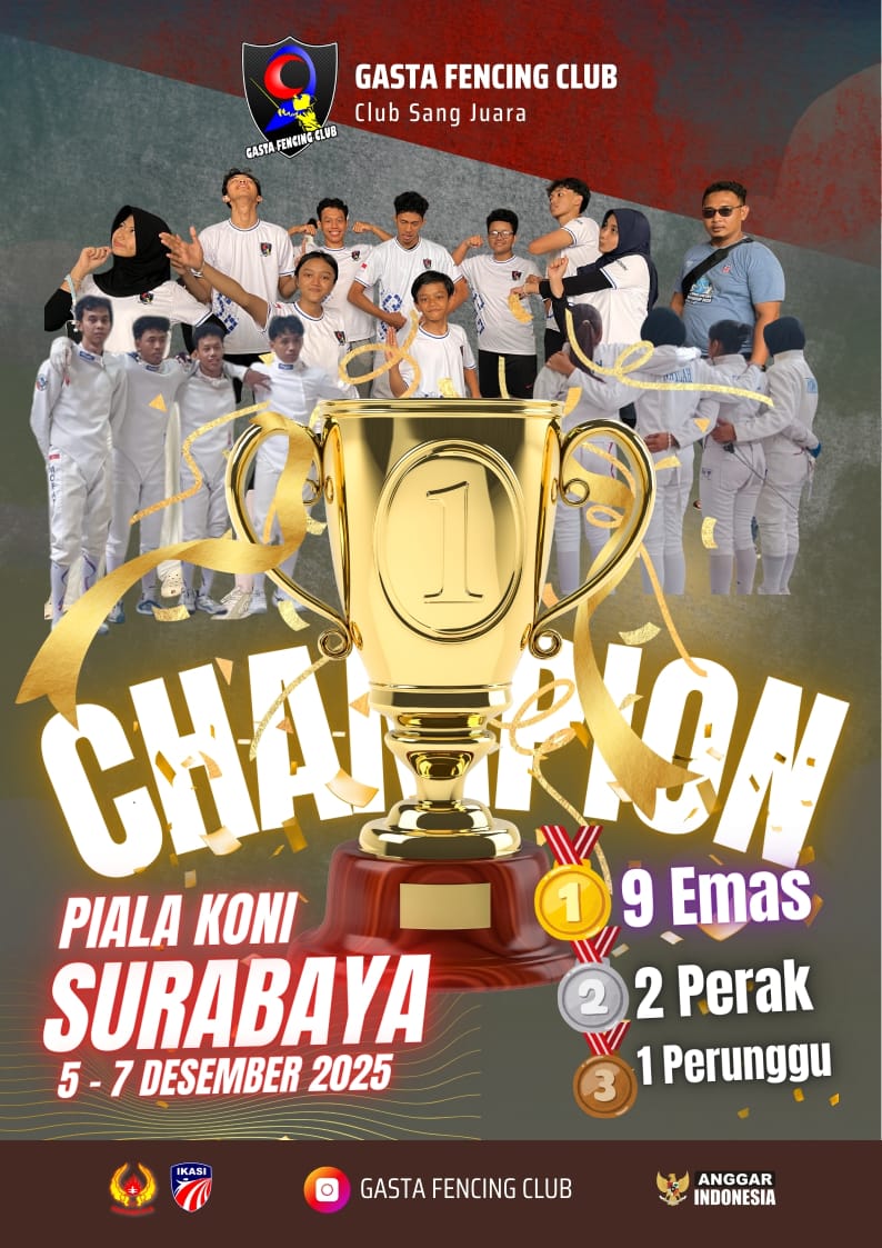Gasta Fencing Club Surabaya, pada Kejuaraan Anggar Piala KONI 2025 kali ini, menurunkan 9 atlet dengan perolehan 9 medali emas, 2 medali perak dan 1 medali perunggu. Mereka merupakan atlet yang bersinar selama Pekan Olahraga Provinsi dalam empat event terakhir dan mampu memberi harapan bagi IKASI jatim.